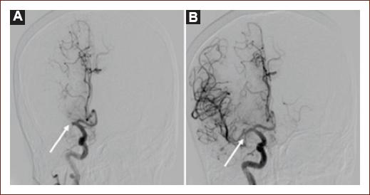 DSA is considered the gold standard to evaluate vessel morphology, level, and occlusion percentage. The thrombolysis in cerebral infarction (TICI) scale was developed for DSA studies with the objective of quantifying response to reperfusion therapies45; nowadays, a modified version (mTICI, Table 1) is used, which reflects the increasing use of MT46. DSA also allows us to evaluate collaterals using the American Society of Interventional and Therapeutic Neuroradiology/Society of interventional Radiology scale (Table 2), which is useful to characterize collaterals quality, with very important implications for clinical outcome47. The use of DSA (outside MT) in AIS is decreasing, although it is still used when in doubt, even after CTA or MRA43. Figure 6 shows a DSA before and after the retrieval of a thrombus that was occluding the proximal right MCA.