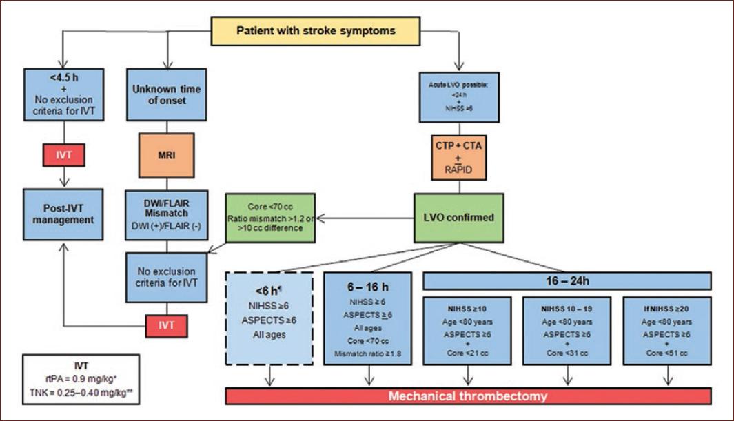After 4.5 h of symptom onset, the only treatment option is MT. Although the therapeutic window has extended up to 24 h, the more time passes, the selection of patients becomes more rigorous and requires more elements to demonstrate viable brain tissue7,35. The criteria on which treatments are based beyond 6 h of evolution, wake-up stroke, minor stroke, and in some specific situations are described below.