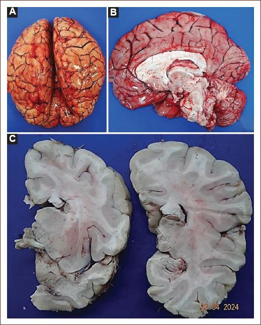 Figure 1 A: dorsal view of the brain. B: sagittal view of the brain; both show severe edema and congestion of the leptomeninges. C: coronal sections showed cortical congestion.