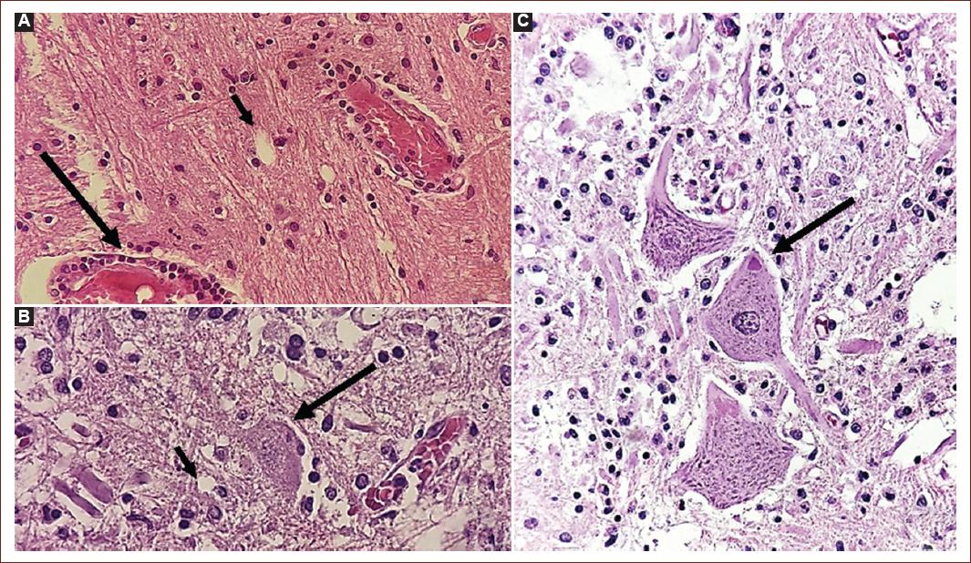 Figure 2 A: brain parenchyma with perivascular lymphocytic infiltrate (cuffs) (long arrow), and neuropil vacuolation (short arrow) in relation to edema. H&E, ×400. B: hippocampus section, degenerated neuron (long arrow), and intense neuropil vacuolation (short arrows). H&E, ×400. C: cerebellum, three Purkinje cells with different degrees of degeneration; the central neuron showed an eosinophilic cytoplasmic inclusion, Negri body (arrow).