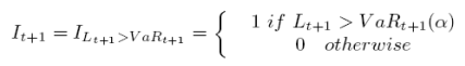 Backtesting procedure entails counting the number of times that losses exceed VaR estimates in approximately 250 independent trading days 8 .McNeil, Frey and Embrechts (2005) use an indicator function I t to accumulate those excessions, exceptions or violations which behave like iid Bernoulli trials with probability 1 − α. Hence,