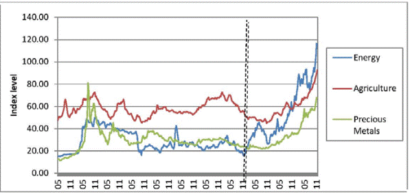 Additionally, McKinsey (2013) emphasises the cyclical behaviour of commodity prices, localising at least three commodity supercycles since the 19 th century, besides the one beginning in the late 1990s. Incidentally, the dashed vertical line in Graph 2 signals Jan-1999 as a period of huge price increases that up to Dec-2007 delivered 497%, 67% and 179% for energy, agriculture and precious metals respectively. However, as a consequence of the financial crisis unravelled in 2008, the trend somewhat reversed and the values for the same indices fell 45%, 19% and 15% respectively.