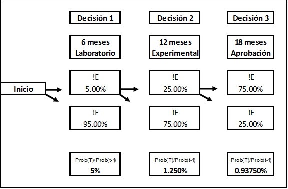 La siguiente tabla expone el proceso acelerado resumido a tres etapas de decisión, sin considerar riesgos de mercado y solamente la exposición a la resolución de incertidumbres tecnológicas.