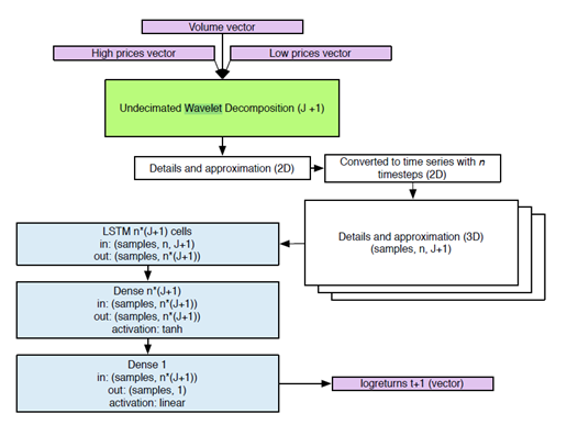 On the realm of high frequency data, Ortega and Khashanah (2014) apply a neurowavelet approach to 1-minute frequency data of Apple AAPL stock prices. They apply a non-decimated Haar wavelet decomposition followed by the Jordan (1997) and Elman (1990) networks, due to their ability to capture temporal patterns. They compare one, three and five-step ahead forecasting to ARIMA and ARIMAX and find that the neurowavelet model outperforms the other models. Arevalo et al. (2018) propose a discrete wavelet transform (DWT) and a deep neural network (DNN) to forecast one-minute and 3-minute log-returns of 19 stocks in the Dow Jones Index, and they find that the model has an accuracy rate between 64% and 76%. Our work is directly inspired by both studies and builds on them by proposing a neurowavelet model that uses Long Short-Term Memory (LSTM) units, which have internal logical gates that provide the model with an increased ability to remember data from previous time steps and to model even more complex non-linear behavior.