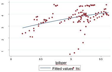 En la gráfica 2 se representan gráficamente los datos del número de cajeros automáticos y el producto interno bruto real per cápita en ocho economías de América Latina en el periodo 2004-2018. La gráfica muestra la dispersión de las observaciones y la línea de tendencia ascendente que indica una relación positiva entre las variables, se puede argumentar que los países con un mayor número de cajeros automáticos por cada 100000 adultos están en mejores condiciones para elevar su PIB real per cápita. Además, es más probable que los países con un mayor PIB real per cápita ostentan un mayor número de cajeros automáticos por cada 100000 adultos. En resumen, la gráfica 2, apunta a la idea de que el desarrollo financiero impulsa el producto interno bruto real per cápita y a su vez el producto interno bruto real per cápita afecta positivamente al desarrollo financiero.