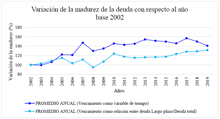Para enriquecer el análisis, se realiza un comparativo (Figura 4) entre la manera tradicional en que se calcula el vencimiento de la deuda (razón entre la deuda a largo plazo y la deuda total) y la manera que se propone en esta investigación (promedio ponderado anual) usando como base el año 2002. Se alcanza a ver que hasta el año 2010 ambos métodos se mueven de una manera muy similar, sin embargo, de ahí en adelante comienzan a verse ciertas diferencias, mostrando cambios un poquito más notorios la variable propuesta en este estudio, en cambio la razón de deuda de largo plazo, que se usa tradicionalmente como proxi de la madurez, se modela prácticamente invariante.