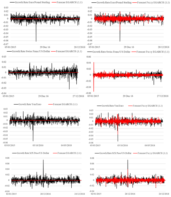 For the out sample test in the table 2 shows that mean absolute deviation for the growth rate of Mexican Peso/ American Dollar in the sample is 0.34% for the EGARCH(1,1) and 0.37% to the Fuzzy EGARCH (1,1), in the case of the Yen/Euro is 0.35% for the EGARCH(1,1) and 0.35% in the Fuzzy EGARCH (1,1), the Swiss Franc/ US Dollar is 0.28% for the EGARCH(1,1) and 0.26% in the Fuzzy EGARCH (1,1) and finally the Euro/ Pound Sterling presented an error daily of 0.34% for the EGARCH(1,1) and 0.37% in the Fuzzy EGARCH (1,1). These results and the Figure 9 denoted that the Fuzzy GARCH model has more variability in the forecast out the sample and this cause that the mean absolute deviation in some cases is lower in the EGARCH (1,1) than the proposed model.