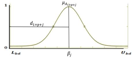 where μA1+i+jβjk represents the membership function of the fuzzy set of the parameter βjk , βj is the center and δβj is the variance. And d1+p+j is the distance where there is 99% of all parameters in this membership function.