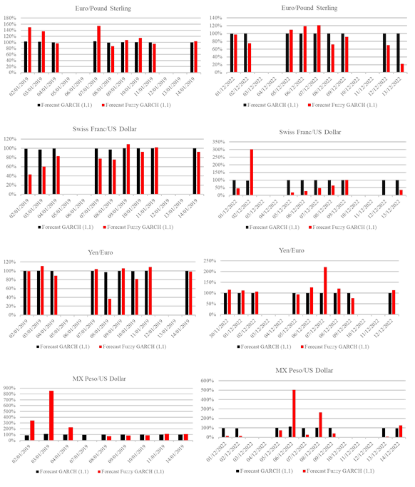 Furthermore, the table 1 shows the performance comparison of the mean absolute deviation for the growth rate of Mexican Peso/ American Dollar in the sample is 0.57% of daily error for the GARCH (1,1) and 0.42% for the Fuzzy GARCH (1,1) there is a difference of 0.15% of lower error in the proposed model. In the case of the Yen/Euro, the GARCH (1, 1) have 0.11 more error than the Fuzzy GARCH (1, 1) model. The mean absolute deviation of the Swiss Franc/ US Dollar is of 0.41% for the GARCH (1,1) and 0.30% in the Fuzzy GARCH (1,1) this represents that the suggested method has 0.11% lower deviation than the traditional model and finally the Euro/ Pound Sterling presented 0.41% for the GARCH (1,1) and 0.30% in the Fuzzy GARCH (1,1). On average the model-based in fuzzy theory presents a 0.11% lower error than its similar basic model.
