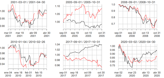 Note: The red line is the IPC index while the black line is the S&P500 index. For critical years, a notable convergence of time series appears while for the relatively “tranquil” years 2005 and 2017, indices diverge.
