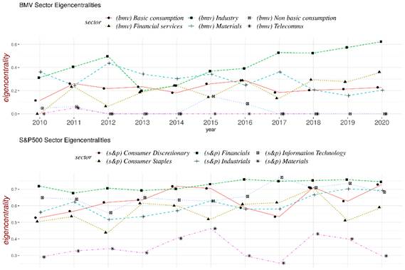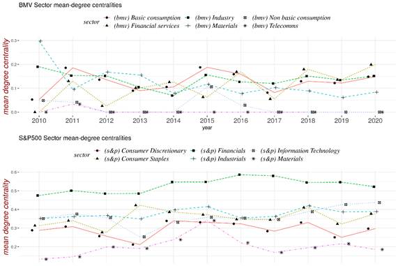 In Figure 10 we present time series of eigen-centralities estimated by year and by industrial sector from networks based on partial correlations. In the upper panel the information is for Mexico and in the lower panel the corresponding information is for the U.S. The reader should compare the y-axis to confirm that the eigen-centralities for the Mexican market are lower than those for the American market. In Figure 11 an analogous comparison is presented with respect to mean degree-centralities and the same conclusion holds true. Thus, confirming through network metrics the visual evidence of low connectivity of sectors in the BMV, Figure 7, left-hand side.