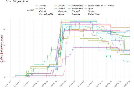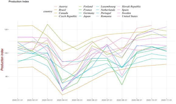 On March-2020 the world witnessed the start of a global response against the COVID-19 pandemic with a variety of public policies, most notably a generalized “lockdown”. To substantiate the qualifier “globalized”, in Figure 12 we present the Oxford stringency index for the following selection of countries: Austria, Brazil, Canada, Czech Republic, Finland, France, Germany, Japan, Luxembourg, Netherlands, Portugal, Romania, Slovak Republic, Spain, Sweden, the U.S. and Mexico. The highest levels of the index represent stricter responses to the pandemic. It is clear from the Oxford stringency index that all the countries in the list started strict security initiatives in March-2020. Those measures included the lockdown of cities and regions, which ultimately led to a sudden economic halt as can be inferred from Figure 13 below. Figure 13 below presents the Production index for the following list of countries: Austria, Brazil, Canada, Czech Republic, Finland, France, Germany, Japan, Luxembourg, Netherlands, Portugal, Romania, Slovak Republic, Spain, Sweden, and the U.S. The time series were downloaded from the corresponding Government agencies but our starting point was a directory of the International Monetary Fund. Again, March-2020 represents the turning point when the index started to sink with local minima around April or May.