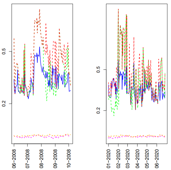 In fact, the estimated time series exhibit an interesting feature. In the left-hand panel of Figure 14, the metrics for the second semester of 2008 are shown. Clearly this is a period related to the subprime mortgage crisis and in particular during September came the announcement of the Lehman Brothers bankruptcy. Beyond the up-and-down swings it can be appreciated that between July and August of 2008 the centralities soared relative to values on other days. An analogous description follows for the right-hand panel presenting the metrics for the first semester of 2020, obviously related to the COVID-19 pandemic. Between February and March, we see centrality metrics with high levels relative to other days.