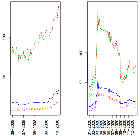 Let us start with an evident comparison. There is a huge increase of degree centrality on the right-hand side, which seems to signal a jump, and a large one. On the left-hand side, we also see an increasing tendency but not so steep. This makes sense. For the subprime mortgage crisis, the year 2007 was already turbulent with a contained but unusually high volatility. This comes in tandem with maintained high correlation levels across-markets for 2007 and the first semester of 2008. Then, as the second semester of 2008 advanced, volatility and correlation also increased. Apparently, this was the “market prediction” of a forthcoming big event. Of course, the exact event was unknown, particularly nobody could forecast the Lehman Brothers bankruptcy with certainty. Now let us take a look at the other crisis. Starting from the outbreak in Wuhan China, the development of the pandemic was very fast. Already in January-2020 there was big media coverage of the contagion in Europe, particularly in Italy and then Spain. Perhaps it is not an exaggeration to say that, beyond the financial world, it was the start of an anticipated recession transforming every aspect of society. In particular, it caused the reaction of financial markets all over the world. Indeed, this accelerated development, full of bad news, formed pessimistic expectations leading to an increase of volatility and correlation.
