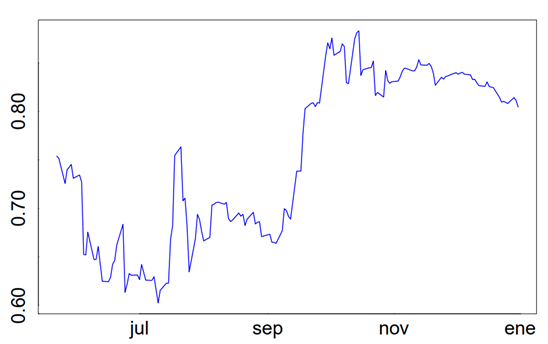 To conclude this section, we include in Figure 16 the graph of Pearson correlations for the S&P500 and IPC indices for the subprime mortgage crisis. Correlations are estimated from a sliding window of 60 observations. It is clear that the time series “rallies-up” after September 2008. Thus, it reacts after the main event of the Lehman Brothers bankruptcy announcement, in contrast to centralities that react circa three months before.