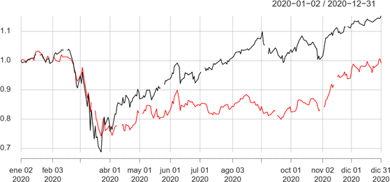 Figure 2 Comparison of (normalized) S&P500 and IPC indices during the current COVID-19 pandemic. Co-movements are evident.