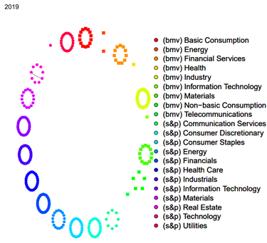 Note: Stocks from the S&P500 index are represented by circles. A node representing a stock from the BMV market has a square shape. As visual guide, the BMV sectors start clockwise at 12:00 and then advance to the right up to circa 5:00.