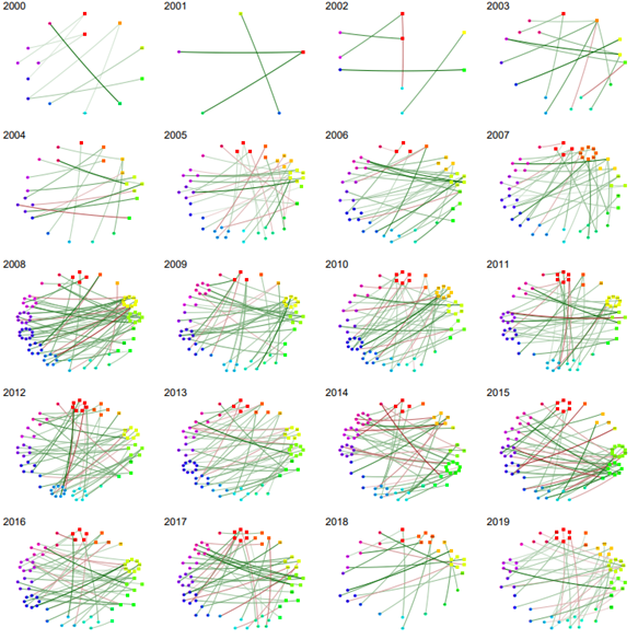 Figure 5 Graphs based on partial correlation matrices, by year, in the period 2000-2019.