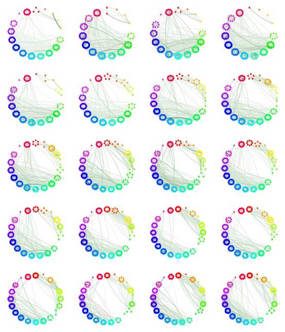 Figure 6 Graphs associated with partial correlation matrices, by year, in the period 2000-2019.