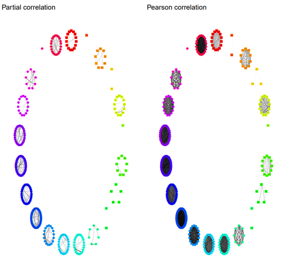 Our analysis is based on the association of networks to partial correlation matrices and of network centralities. For the estimation of partial correlation matrices, we follow the statistical procedure explained in subsection 2.4 below. It is an implementation of the estimator in Meinshausen & Bühlmann (2006) of neighborhood selection in a sparse high dimensional graph.
