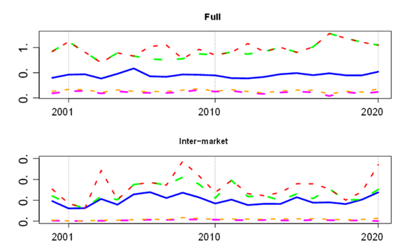 In Figure 14 we report inter-market centralities based on partial correlations estimated from a sliding window. Each window is computed daily and accounts for approximately a span of three months.