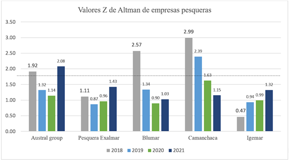Como se observa en la Figura 1, Austral Group supera el valor 1.81 (límite inferior de la zona de quiebra) en el periodo 2021, mientras que el resto de las empresas caen en la zona de quiebra al obtener valores inferiores al límite en el mismo periodo. Por tanto, es importante hacer un seguimiento a este indicador en los siguientes periodos.