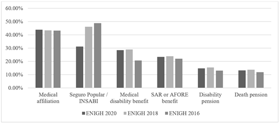 The results of the National Household Income and Expenditure Survey (ENIGH for its acronym in Spanish) conducted in 2016, 2018 and 2020 show similar results in terms of access to medical affiliation, health care services through the Seguro Popular or Insabi and other social-protection related benefits (Figure 2). Less than half of the population interviewed in these surveys report access to these services.