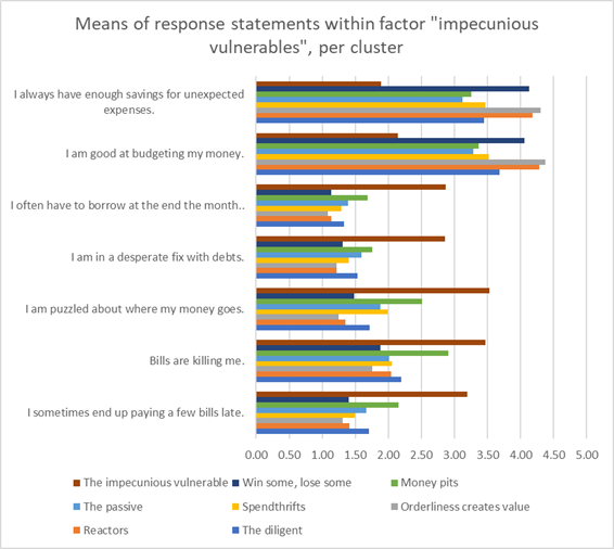 The 36 statements of the questionnaire are grouped according to the factors carried out as the first step of our investigations, and we see what average values are typical for the “impecunious vulnerable” cluster for each item, and where this average is located in relation to the other clusters.