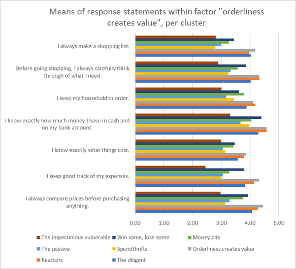 The next statement group summarises those belonging to the orderliness creates value factor. In the case of all 6 statements, it is true that the lowest averages are found for the vulnerable (see Figure 3). The results show that those belonging to the financially vulnerable group typically do not prepare for purchases either by getting to know the prices in advance or by making a shopping list. They do not pay attention to price comparisons during the act of purchase, nor do they keep track of their expenses afterwards. Law enforcement is the least typical of those who belong to “the “impecunious vulnerable” cluster. Keeping one's household in order is an important aspect of financial awareness. People who keep their household in order usually also know what they need, so they buy less unnecessary things. On the other hand, the test results also show that those who are tidy keep their household and finances in order. This is therefore a more comprehensive statement that does not only affect finance, but at the same time has a strong impact on finance.