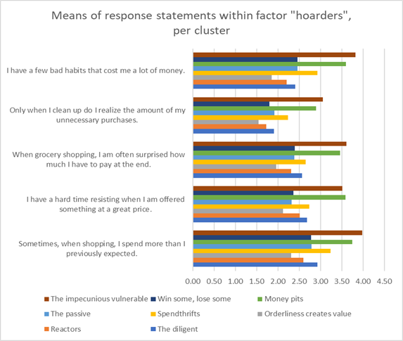 The following statement group summarizes those belonging to the hoarders’ factor. Figure 4 also clearly shows that hoarding - as a bad habit, hoarding, buying unnecessary things - is most characteristic of two clusters: the money pits and “the impecunious vulnerable”. In all but one statement, the highest average appears for the vulnerable. Postponing the fulfilment of needs causes them difficulty, and this is one of the reasons why they cannot make a conscious decision during their purchases. Vulnerable people with little money are most likely to have some bad habits that only take money. In addition, vulnerable people with little money and hoarders are similar in that they do not keep the household in order and are surprised when it turns out how much they have actually spent.