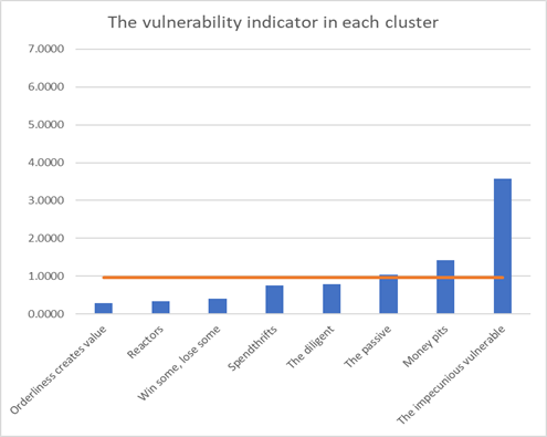 Graphically represented in Figure 7, it is clear that the vulnerable with small amounts of money significantly “fall out of line”, they are an extremely vulnerable group. Money pits and the passive received a higher than average value for vulnerability, although they deviated from the average to a lesser extent. Regarding vulnerability, the differences between the groups are significant (F=2264.803, p<.000). However, further research is needed to answer the surprising result, why the diligent are more vulnerable from a financial point of view than both the spendthrifts and the respondents characterised by the behaviour of “win some, lose some”.