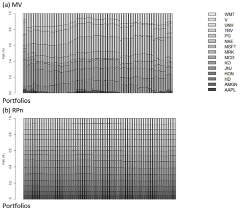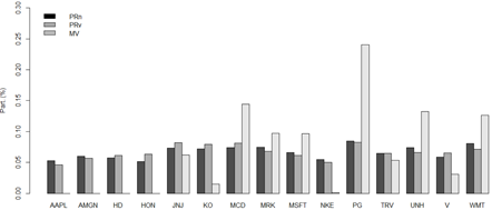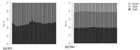 Los resultados confirman cambios frecuentes que presenta el portafolio MV, es decir, estos resultados ratifican el problema de sensibilidad que tiene este modelo frente a los parámetros estimados, como fue señalado atrás. Además, se identifica la exclusión de gran parte de los activos que componen el portafolio. En el caso del portafolio PRn, los cambios de un periodo a otro son mínimos o incluso nulos en algunos casos, lo cual confirma la mayor consistencia de este enfoque frente al modelo MV.