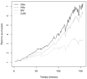 La gráfica 2 muestra los retornos acumulados para los portafolios óptimos y el índice DJIA, confirmando un mejor resultado para los portafolios de PR, aunque sin mayor diferencia para PRn y PRv. Estos resultados confirman las ventajas de los modelos de PR, frente al modelo tradicional MV. Ahora bien, con el propósito de llevar a cabo un ejercicio mucho más robusto de verificación de los resultados y, que permitan mostrar la consistencia de los portafolios de PR, frente al portafolio MV, se realiza un ejercicio de rebalanceo mensual de los portafolios tomando una ventana móvil de 60 meses.