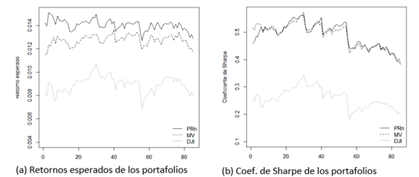 La gráfica 4 muestra los cálculos de los retornos esperados y el coeficiente de Sharpe de los portafolios para cada actualización en todo el periodo de análisis. Allí se observa una mejora en el retorno esperado del portafolio PRn y un mayor coeficiente de Sharpe en la mayoría de los periodos. Además, en ambos casos la diferencia con respecto al índice DJIA es notable.