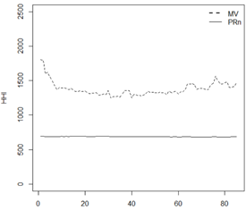 El índice HHI se calcula para todos los portafolios obtenidos en el ejercicio de rebalanceo. La gráfica 5 muestra el HHI de los 85 portafolios móviles. Mientras que el HHI del portafolio PRn se encuentra alrededor de 700, el del portafolio MV varía entre 1.400 y 1.800, mostrando así una alta sensibilidad. Esto refleja los cambios significativos que presenta su composición cuando cambia la muestra de datos.