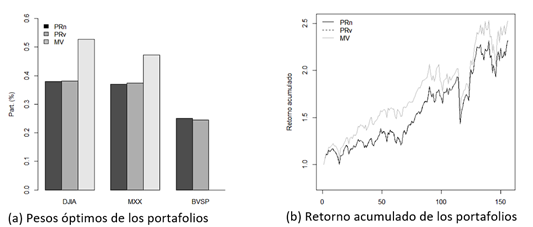 Los resultados confirman diferencias significativas en la composición de los portafolios y la alta concentración del modelo MV en comparación con las alternativas PRn y PRv. Se destaca la menor diversificación del portafolio MV, con una participación superior al 50% en el mercado DJIA y la exclusión del BVSP. En cuanto al desempeño histórico, los portafolios PR no alcanzan buenos resultados en comparación con el modelo MV, como se observa en la gráfica 6b y la tabla 4.