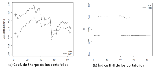 El índice HHI para los 85 portafolios móviles presenta un menor grado de concentración para el portafolio PRn, en comparación con el portafolio MV. Mientras que para el portafolio PRn este indicador se encuentra por debajo de 3.600 con pequeños cambios, para el portafolio MV el indicador oscila entre 5.000 y 5.100.