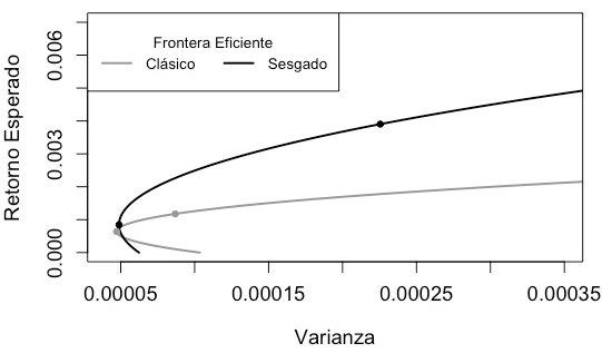 La frontera eficiente sesgada y clásica utilizando μ~,Σ~d y μ^,Σ^d , respectivamente, se puede observar en la Figura 1. En esta figura, la media y la varianza de las carteras óptimas (carteras VMG y RS) están marcadas en la gráfica de la frontera eficiente correspondiente. Las fronteras eficientes convergen en el punto de menor riesgo, sin embargo, a medida que éste aumenta, la frontera eficiente sesgada tiene un rendimiento esperado cada vez mayor al de la frontera clásica por cada unidad de riesgo. Lo anterior indica que la frontera eficiente sesgada refleja un menor apetito por el riesgo comparada con la frontera clásica.