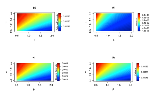 La Figura 3 muestra gráficos de imagen de superficies correspondientes a la media y varianza obtenida mediante el uso de carteras óptimas sesgadas con β0.5, 2,  α0.5, 2 y α1= α2=α . Los gráficos de imagen para carteras óptimas sesgadas basadas en el modelo de varianza mínima global se presentan en la Figura 3(a)-(b) mientras que los correspondientes a la razón de Sharpe se muestran en la Figura 3(c)-(d). Se observa una tendencia similar en todas las gráficas, con la media y la varianza de la cartera óptima sesgada aumentando a medida que β decrece y α se incrementa. Sin embargo, los cambios en los respectivos niveles de la media (retorno esperado) y la varianza, calculados utilizando el modelo de varianza mínima global, no parecen variar mucho; ver los valores en la escala de colores de la Figura 3(a)-(b). Además, el sesgo α no parece afectar a la varianza cuando los valores de β son mayores que 1. Los niveles de media y varianza parecen variar un poco más en el modelo de la razón de Sharpe; ver los valores en la escala de colores de la Figura 3(c)-(d). La Figura 4 muestra gráficos de imagen de las superficies correspondientes al rendimiento acumulado semanal para el estado futuro de las carteras óptimas en estudio (varianza mínima global y carteras de la razón de Sharpe). El gráfico de imagen para carteras óptimas sesgadas basadas en el modelo de varianza mínima global se muestra en la Figura 4(a), mientras que el gráfico correspondiente a la razón de Sharpe se muestra en la Figura 4(b).