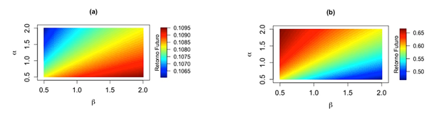 En la Figura 4(a), el rendimiento acumulado semanal más alto para el estado futuro se obtiene aumentando el valor de β y disminuyendo el valor de α , mientras que en la Figura 4(b) ocurre lo contrario. Además, los cambios en los niveles de rendimiento acumulativo semanal (retorno futuro), calculados utilizando el modelo de varianza mínima global, no parecen variar mucho. Sin embargo, estos niveles parecen variar un poco más en el modelo de razón de Sharpe. Esto ya se había observado para la media y la varianza de ambos modelos.