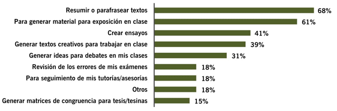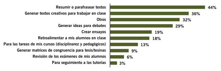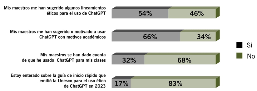 Otro hallazgo importante fue en relación a que 24% de los profesores no se ha percatado de que sus estudiantes utilizan ChatGPT en las tareas. Por último, 37% de profesores no ha tenido la iniciativa de sugerir a sus educandos el aprovechamiento de esta IA. El resultado de la ponderación de los cuatro resultados nocibles anteriores es de 40%, por lo que se puede inferir que es poco probable que los maestros repliquen algún criterio normativo debido a que no conocen ninguno, no han sido capacitados, no se dan cuenta de que sus alumnos usan ChatGPT y tampoco recomiendan su aprovechamiento.