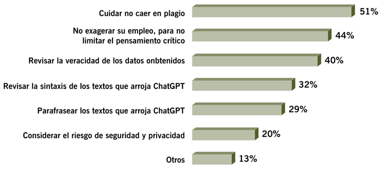 Cabe señalar que, simultáneamente a la emisión de leyes para la regulación del uso de ChatGPT, existen algunos institutos como el Tecnológico de Monterrey que ya expuso once lineamientos para el uso de la inteligencia artificial (Ruiz, 2024). Sin embargo, es de vital importancia difundir y crear debates a nivel nacional para establecer normatividades a favor del aprovechamiento ético y adecuado de la IA en todas las instituciones de educación superior, algunos consejos a seguir son: plantear orientaciones claras tanto para estudiantes como para profesores en el uso de ChatGPT; vincular el aprovechamiento de este chatbot con los resultados de aprendizaje; revisar y actualizar las políticas relativas a la integridad académica; capacitar a docentes, investigadores y alumnos en el planteamiento de preguntas; además de introducir un método de auditoría sobre las IA en general para el beneficio individual y colectivo (Sabzalieva y Valentini, 2023).
