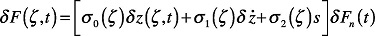 where δF(ξ,t) is the differential friction force at the longitudinal coordinate ζ along the contact patch and time t , δz(ζ,t) is internal state reflecting the deflection of bristles, s is relative velocity and δF is the differential of the normal force. Parameters σ0(ζ),σ1(ζ), and σ2(ζ), are expressed per unit length and represent the stiffness and damping at position. It is assumed that the contact area is constant and the normal force is evenly distributed along the contact patch that has length L , i.e.,