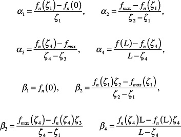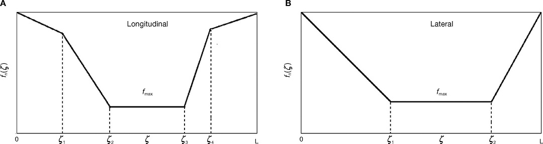 with f max the maximum value of the longitudinal force, ζ 1 , ζ 2 , ζ 3 , and ζ 4 are the coordinates indicated in Figure 13A and: