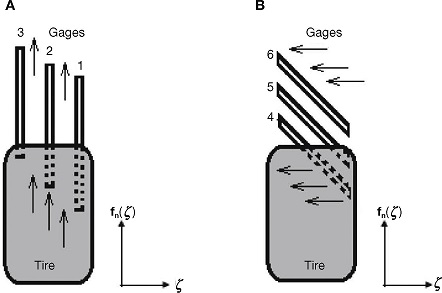The goal of placing longitudinal and transversal of strain gages is to investigate the distribution of forces in the tire-road area of contact with the intention to confirm the shape of this distribution and to prove that for traction/control purposes lumped parameters models capture all the basic features of tire-road friction forces. The placement of the strain gages 1-6 (Fig. 8) was decided with the following rationale. Gages in the longitudinal direction, 1-3, are intended to investigate the longitudinal force and how this force changes at different positions of the transversal direction of the tire (Fig. 12A). Gages in the diagonal direction, 4-6, measure continuous changes of the force in both the longitudinal and transversal directions (Fig. 12B). By analyzing the force patterns in the complete set of strain gages, conclusions about the force distribution can be reached.