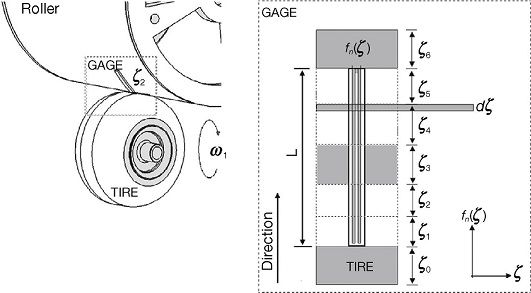Pseudo-static models give only information of the total tire-road force. To analyze the force distribution in the contact patch, some authors use sensors in two manners. In the first one, sensors are placed on the tire resulting in the so called "smart tires" (Coleri et al., 2009; Castillo, Blanca, Cabrera, & Simón, 2006; Yilmazoglu, Brandt, Sigmund, Genc, & Hartnagel, 2001). In the second case, sensors are placed below the rolling surface in such a way that normal forces in the contact area can be measured (Rose & Guenther, 2009; Muller, Uchanski, & Hedrick, 2003; Ho, Dao, & Hirai, 2011). Sensors on the tire are normally piezo-electric and therefore have limitations on their maximum size that oblige to use networks of sensor to fully cover the contact area. Sensors placed bellow the rolling surface can use piezoelectric or optical sensors and also consist in arrays of discrete sensors. Based on measurements obtained from these sensors, conclusions regarding the distribution of forces can be obtained. Recently, Zhang and Yi (2012) found that the shape of the force in the contact patch has a bimodal distribution and that force in the perimeter of the contact area is larger than inside it.