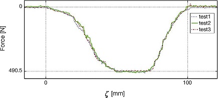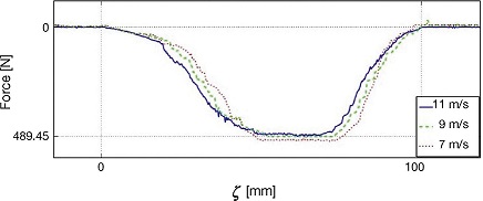 The second set of results is shown in Figure 17, that contains the force plots for three experiments performed at different speeds. Note that, as reported in Burckhardt (1993) and Olmos and Alvarez (2005), force decreases with speed, however, the basic shape of the force distribution is similar for all speeds.