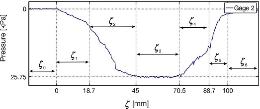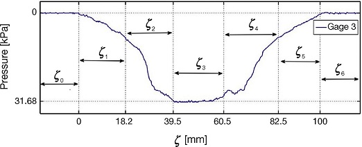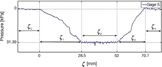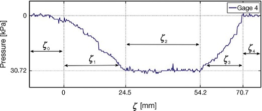 For analysis purposes, in Figure 18 the measurements of force distribution in the contact patch of gage 1 are divided into segments ζ 0 , ζ 1 , ..., ζ 6 . In segments ζ 0 and ζ 6 there is no tire-gage contact. Region ζ 1 is a transition where the tire begins its contact with the gage, that is not completely under the tire. For segment ζ 2 tire is in contact with the gage, however the portion of the tire making contact is composed by a compressed and a flat zone. The intermediate segment ζ 3 corresponds to full tire-roller contact. Segments ζ 4 and ζ 5 revert the behavior of regions ζ 2 and ζ 1 respectively.