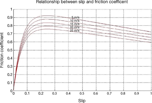where F is the tire-road friction force, z is an internal state representing the average deflection of the bristles in the contact area and s the relative speed of motion between the surfaces, tire and road. Parameters σ 0 and σ 1 represent the average stiffness and damping of the internal state z , while σ 2 is the average viscous friction coefficient between surfaces moving at relative speed s . Finally, function g (s ) is of form: