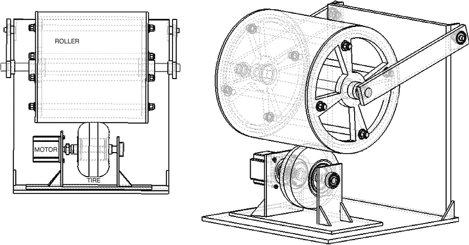 The type of tire used is 4.5/10.0-5 DR10 and has the same basic characteristics as a conventional vehicle tire. The roller is made with high density polyethylene and its radius was chosen to make the contact between tire and roller as flat as possible. To choose the servomotor that moves the setup it is necessary to know the maximum required torque. For this purpose the relation between radius R 1 and R 2, velocities ω 1 and ω 2 and torque τ1 and τ2 was used.
